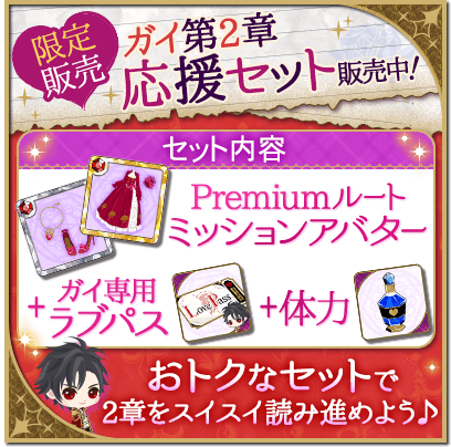 ガイ本編ストーリー第2章のミッションアバターとガイ専用ラブパス、体力が入ったお得なセットを販売しております。