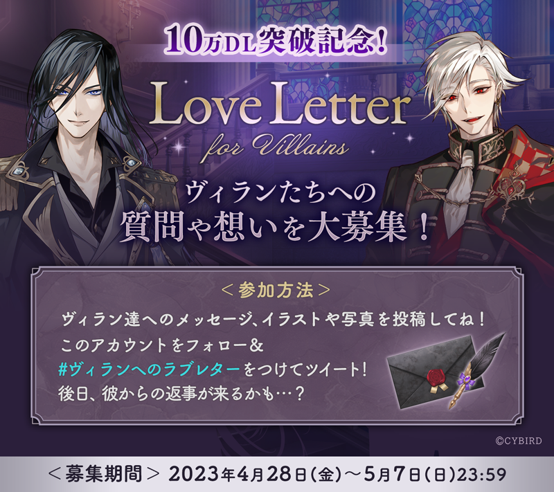 10万ダウンロード突破を記念し、公式Twitter(https://twitter.com/Ikemen_Villains)にて、8人のヴィラン達への質問や思いを募集する「Love Letter for Villains」を開催します。アカウントをフォローのうえ「#ヴィランへのラブレター」をつけて彼らへの質問や思いを投稿してください。投稿した方の中から抽選で、後日彼から返事が貰えるかも……?