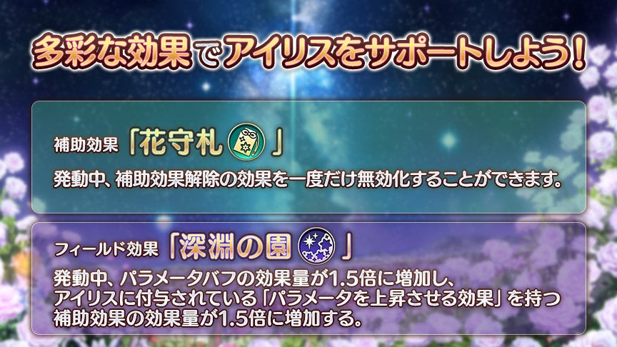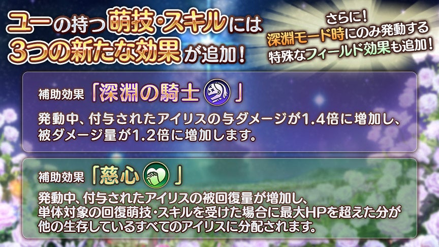 バトルでは新たな補助効果『深淵の騎士』『慈心』『花守札』やフィールド効果『深淵の園』を駆使し仲間のサポートをします。