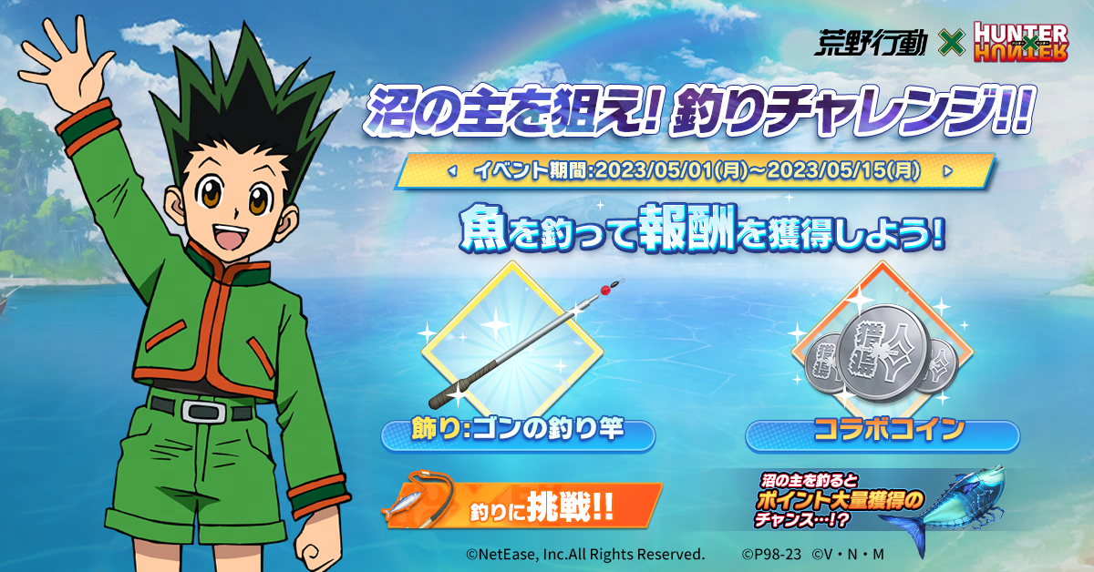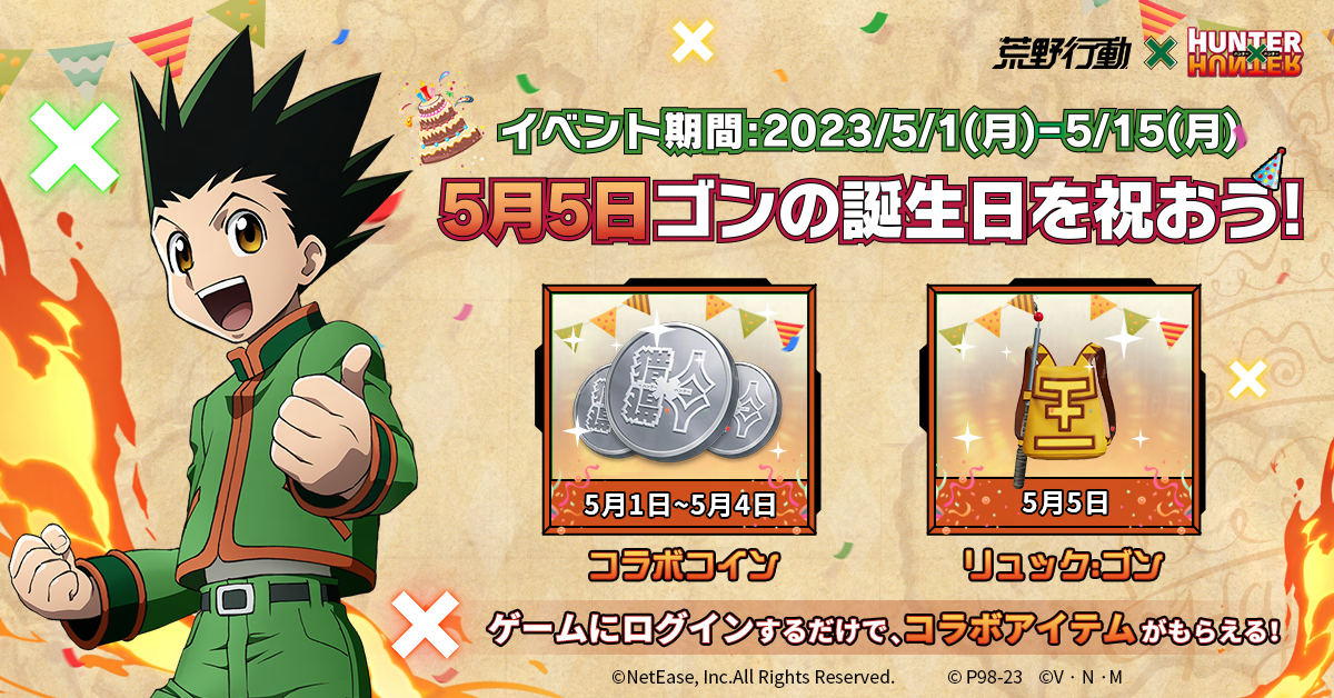 NetEase Gamesが開発・運営する大人気バトルロワイヤルゲーム『荒野行動』にて、2023年5月1日から5月15日の期間中、『HUNTER×HUNTER』とのコラボイベントを開催いたします。