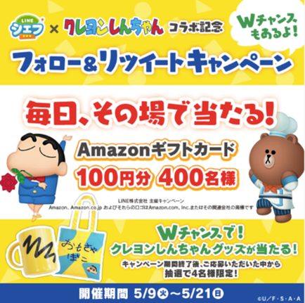 「LINE シェフ」公式Twitterをフォローし、応募条件を満たすとAmazonギフトカード100円分が400名様に当たるキャンペーンを開催します。さらに、Wチャンスとして期間終了後までフォローしてくれている方の中から抽選で4名様にクレヨンしんちゃんグッズをプレゼントします。期間中、毎日応募できますので奮ってご参加ください。