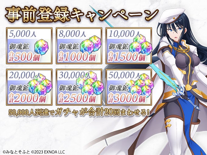 事前登録開始を記念致しまして、キャンペーンを開催致します。事前登録者数に応じて御魂鉱をプレゼントいたします。5万人に到達しますと合計20回ガチャが回せる分の合計3,000個をプレゼントいたしますので、奮ってご参加下さい!