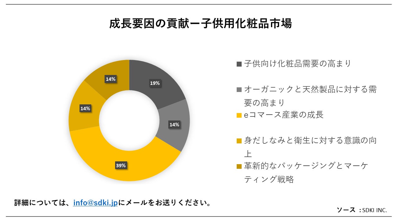 Eコマース産業の成長―Eコマースの成長は、世界の子供用化粧品市場に大きな影響を与え、親が子どものための製品を購入する際に便利で利用しとすい方法を提供しています。例えば、Eコマースの売上は年間約11.51%の成長が見込まれ、子供用化粧品市場を活性化させています。また、オンラインショップでは、オンラインショッピングの手軽さと品揃えの豊富さなどから、子供用化粧品の需要が急増しています。Eコマースの継続的な発展に伴い、子供用化粧品のオンラインデールは今後も拡大すると予想され、新規参入企業と既存ブランドにとって市場調査拡大のチャンスとなります。