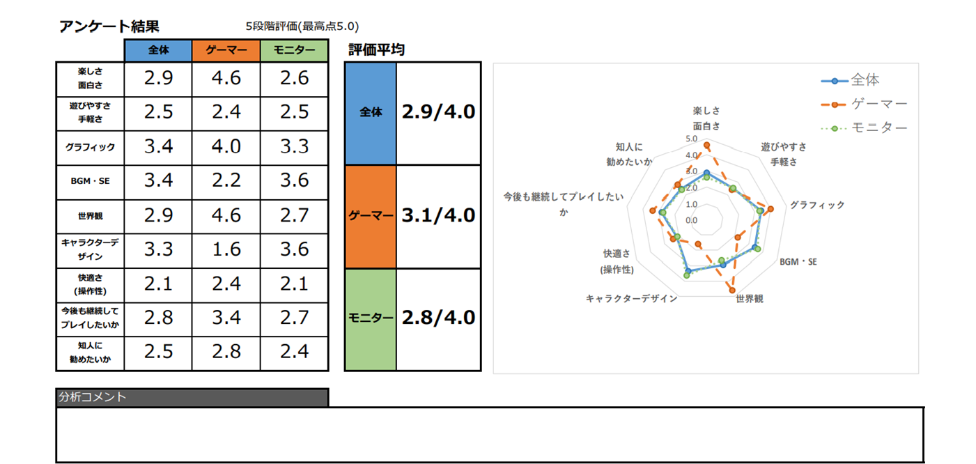 統計分析では、例えばカジュアルゲーマーとコアゲーマーなど異なるペルソナの結果を比較することで、ターゲットのニーズにどれだけ合致しているかを導き出すことが可能となります。