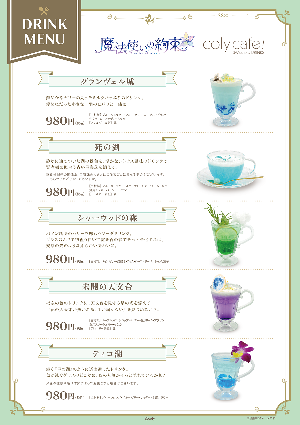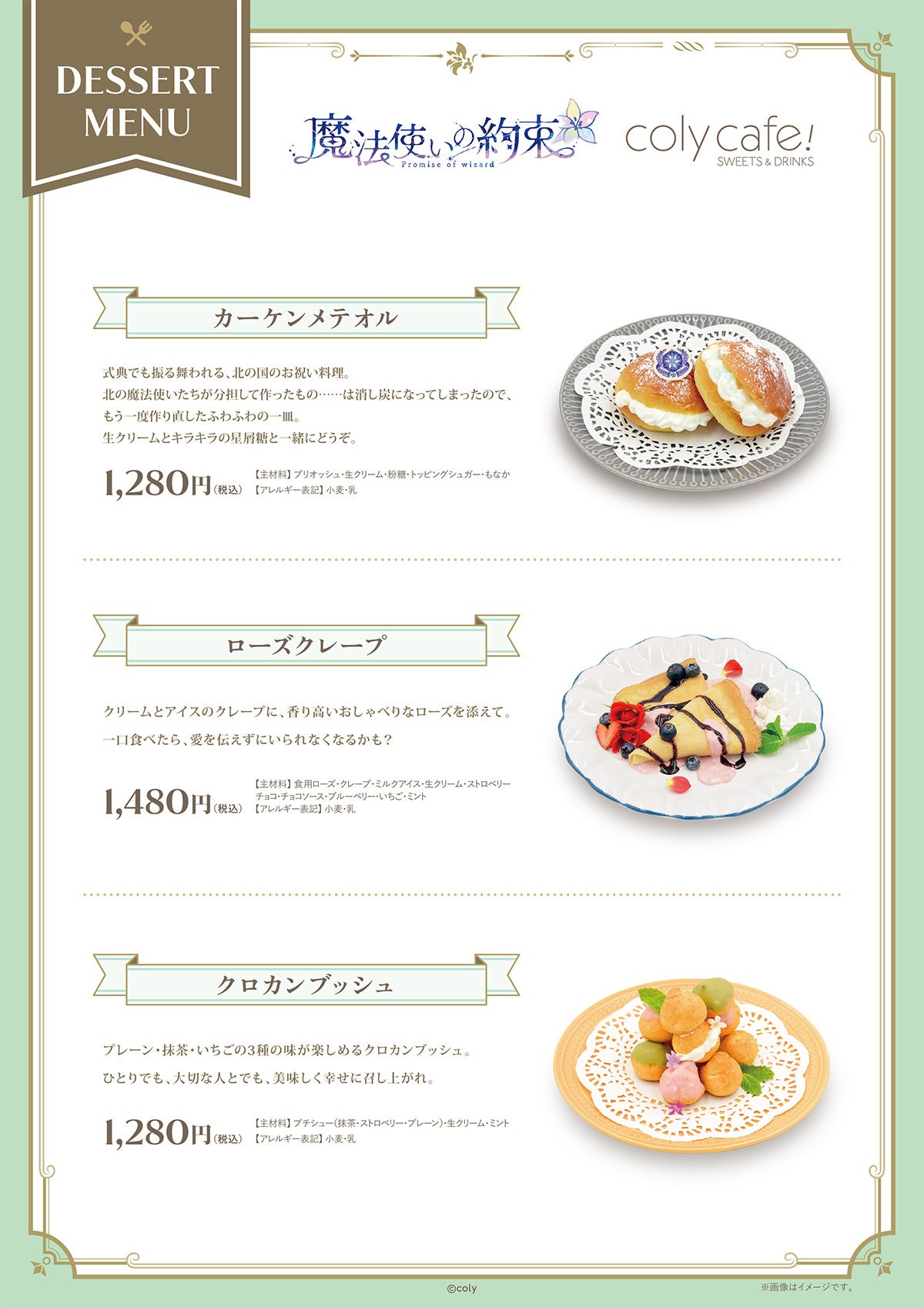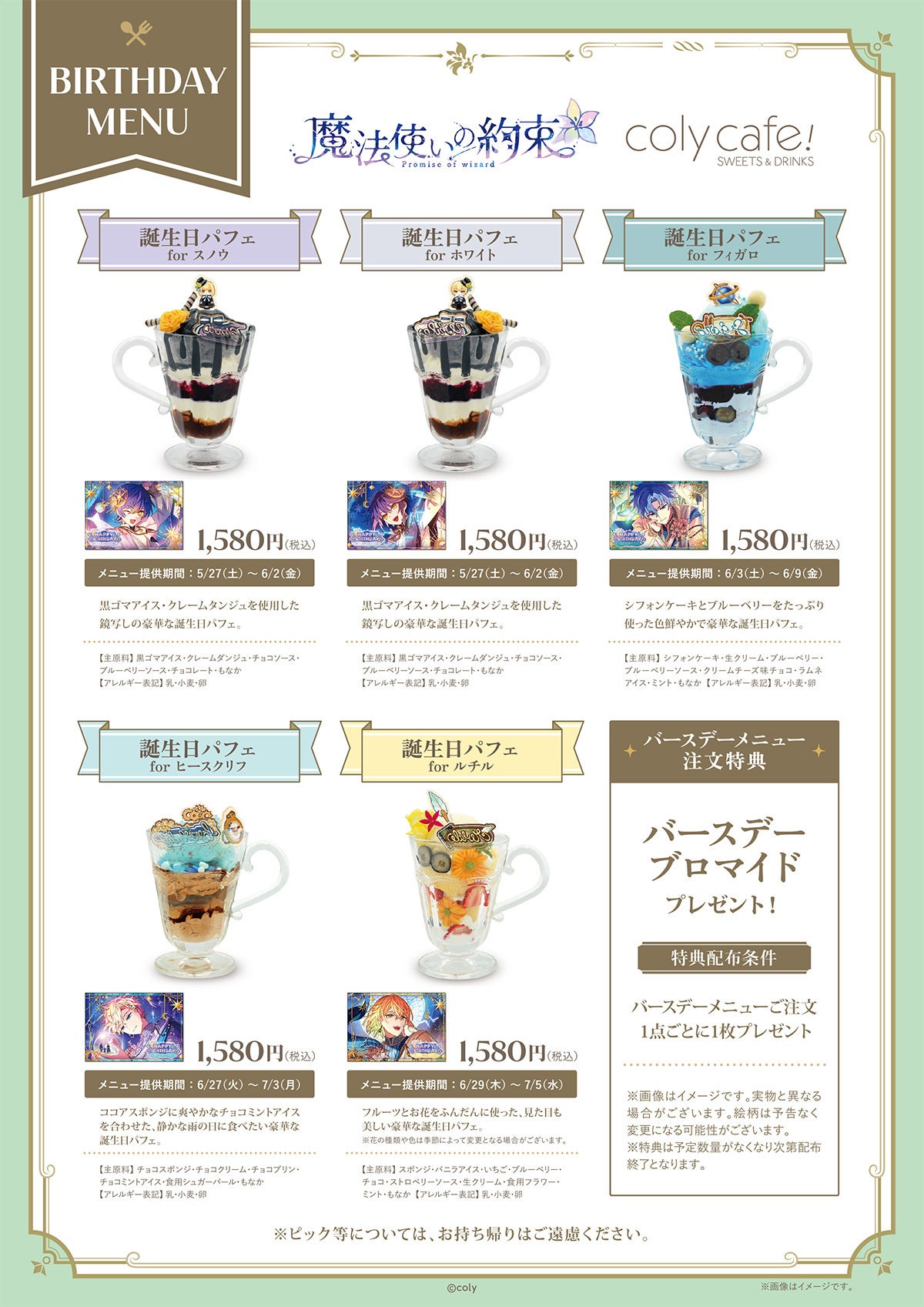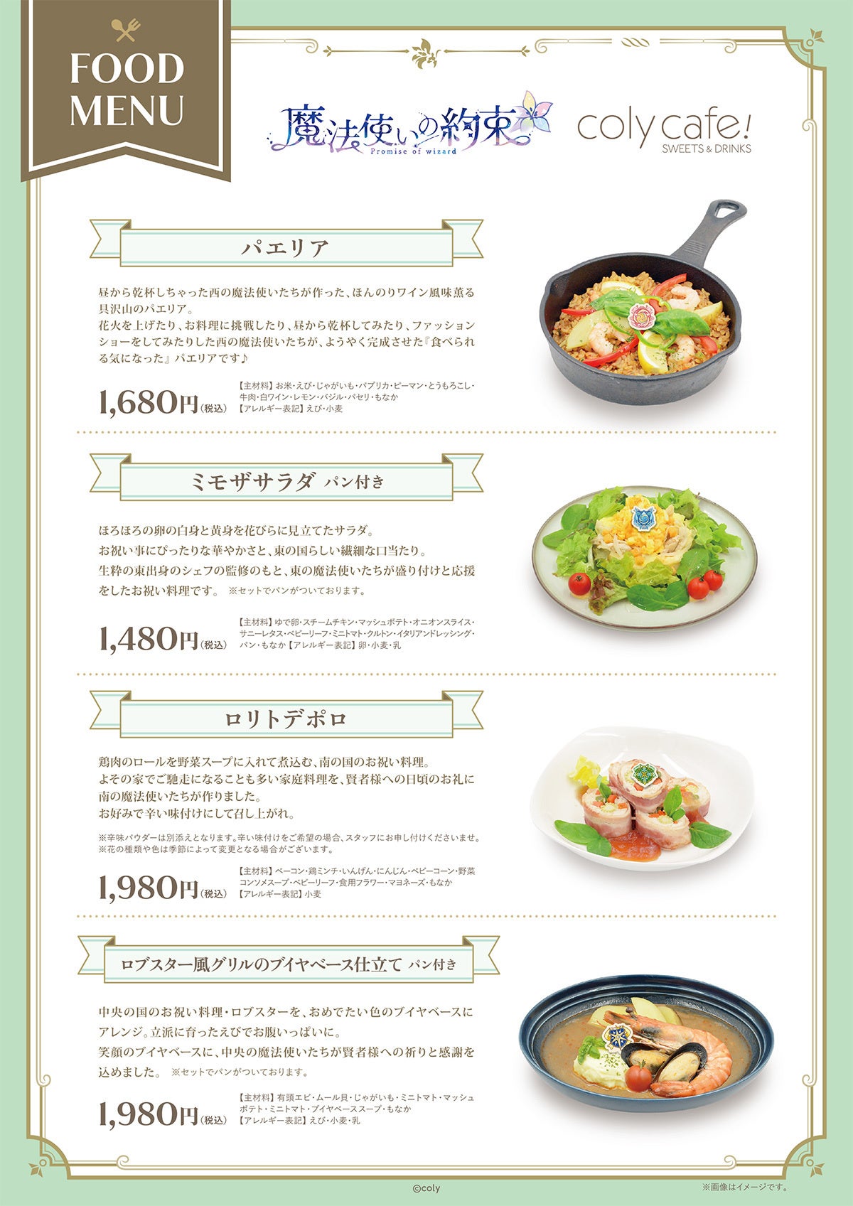 コラボ開催期間中、『coly cafe! 池袋PARCO店』では『魔法使いの約束』に登場するフードやデザート、育成スポットをイメージしたドリンク、魔法使いたちの誕生日をお祝いする誕生日パフェの販売を予定しております。