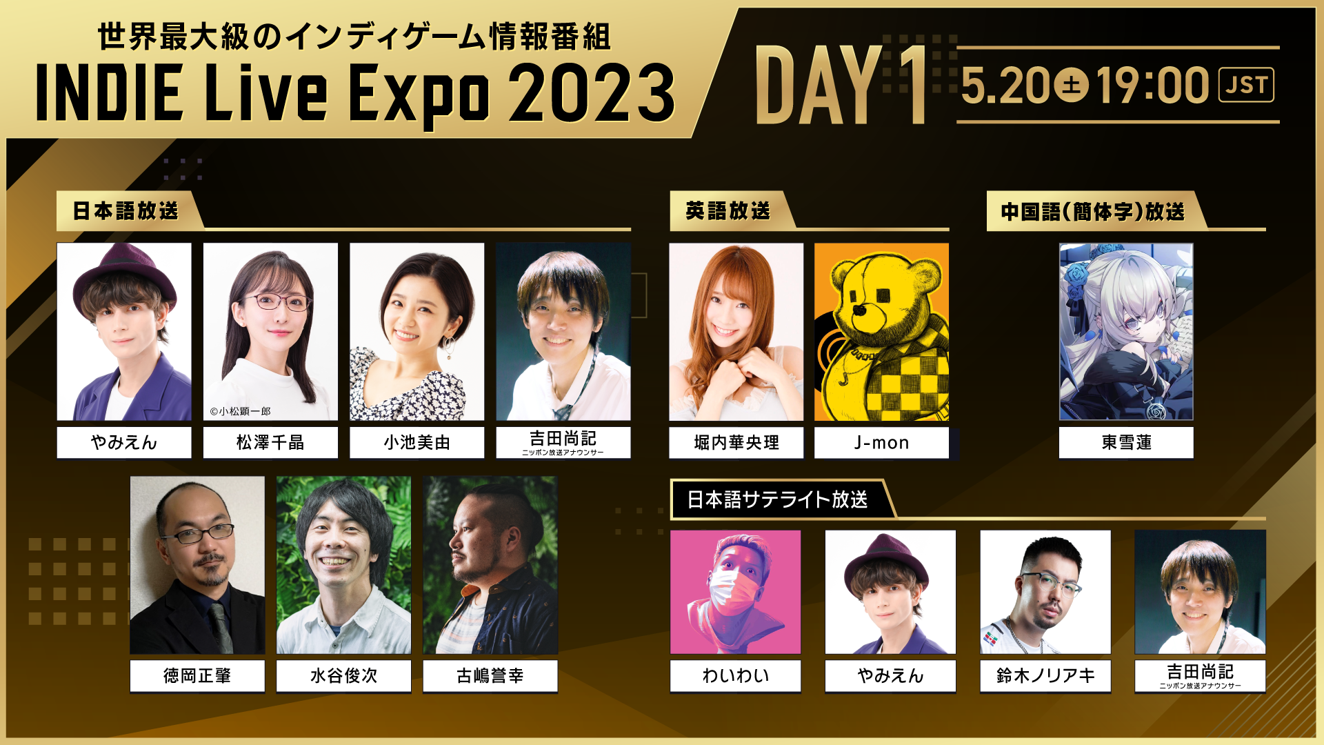 日本語メイン放送:やみえん / 松澤千晶 / 小池美由 / 吉田尚記 / 徳岡正肇 / 水谷俊次 / 古嶋誉幸(INDIE Live Expo レポーター)