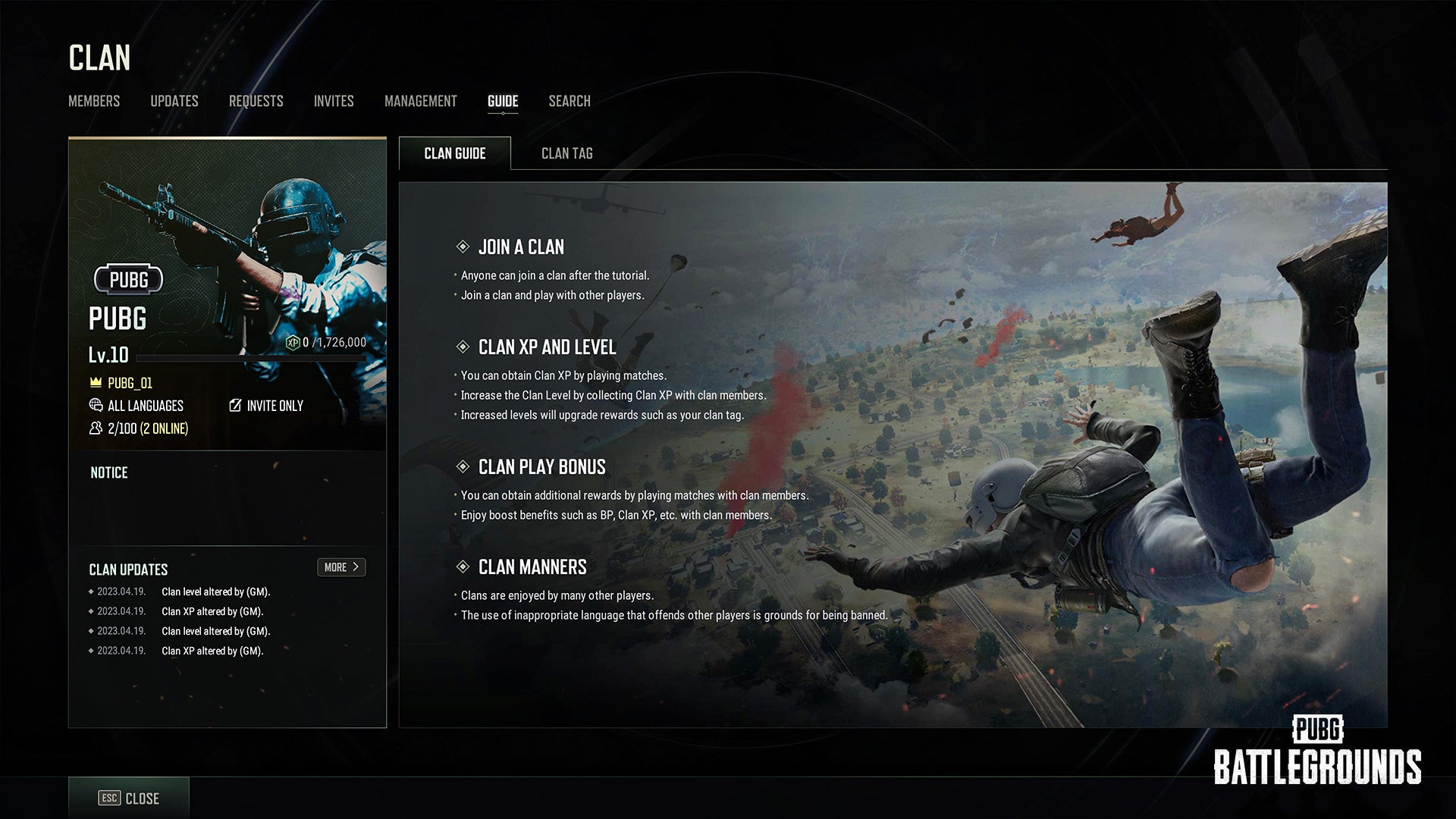 クランをより楽しめるように成長型要素のクランレベルとプレイ報酬も提供されます。クランレベルは、クランメンバーがゲームプレイを通じて獲得する経験値によって上がり、最大レベル20まで上げることができます。クランレベルに基づいてクランタグとタグプレートがプレイヤーのニックネームとPUBG IDに表示されます。また、クランレベルが上がるにつれて様々なデザインのタグプレートを使用することができます。他のクランメンバーとチームを組んで一緒にゲームプレイすると2倍の経験値ボーナスが適用され、より早くクランレベルを上げることができるだけでなくプレイ報酬としてBPに30%のブースト効果も適用されます。
