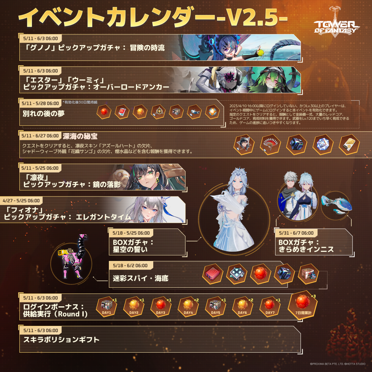 ■ 最新アップデートVer.2.5「煌めく海の囁き」が本日5月11日(木)に実装。新キャラクター『グノノ』(CV: 釘宮理恵 )、新マップを含む追加要素が盛りだくさん!豪華報酬満載の記念イベント開催中!