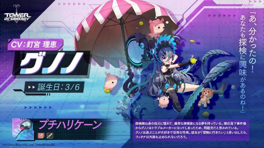 このアップデートでは、新キャラクター『グノノ』(CV:釘宮理恵)とSSR武器「プチハリケーン」が登場します。そして、『グノノ』のキャラクターPVも公開中です。ぜひ新キャラクター『グノノ』の勇姿をご覧ください。