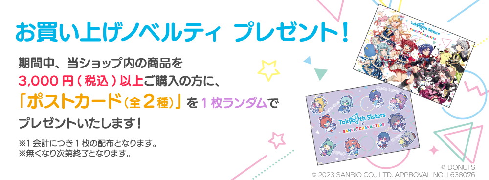 POP UP SHOPでは「EPISODE 2053」に登場するアイドルたちとサンリオキャラクターズがコラボレーションした描き下ろしグッズを販売いたします。期間中に開催店舗にて税込3,000円以上ご購入の方にはお買い上げノベルティとして、2種類の絵柄のポストカードからランダムで1枚プレゼントいたします。