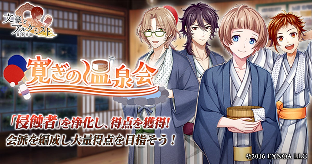 さらに、イベントと同時に開催される限定召装『寛ぎの温泉会』にて新規追加された「中野重治」「小林多喜二」「徳永直」の〈温泉風衣装〉を編成すると、得点の獲得率がそれぞれ30%上昇します。