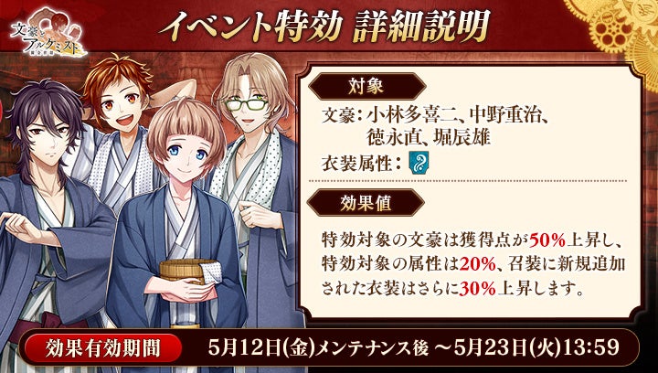 期間中「堀辰雄」「中野重治」「小林多喜二」「徳永直」の衣装を編成して潜書すると、得点の獲得数がそれぞれ50%上昇します。また、「水」属性の衣装を編成して潜書すると、得点の獲得数がそれぞれ20%上昇します。