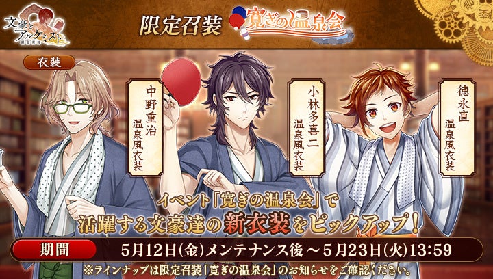 文豪の「衣装」や、会派に装備する事で能力を強化できる「装像」などが入手できるコンテンツ「召装」に、限定召装『寛ぎの温泉会』が期間限定で登場します。この召装では、イベント『調査任務「寛ぎの温泉会」』で活躍する「中野重治」「小林多喜二」「徳永直」の新衣装を一定の確率で入手できます。