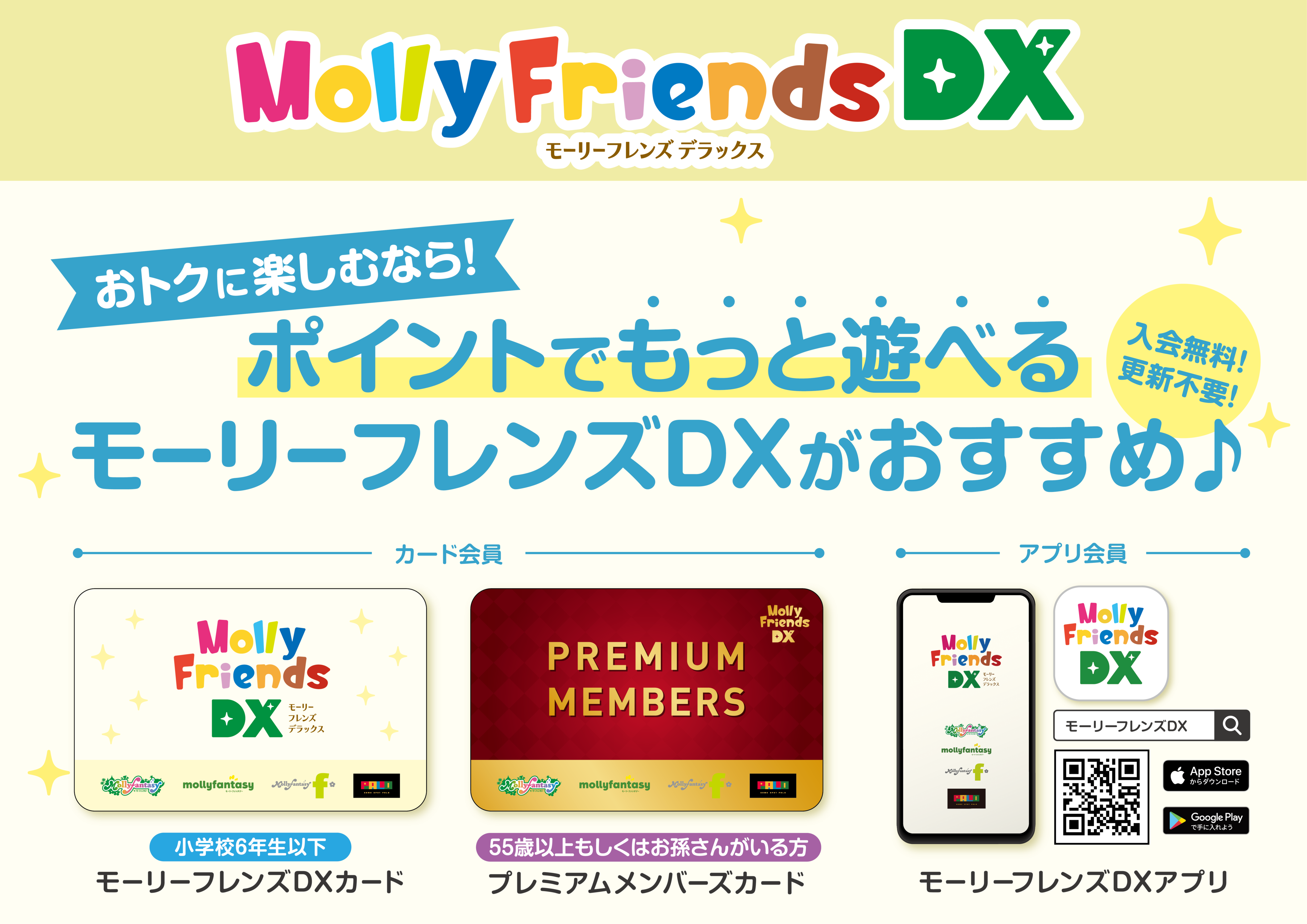 モーリーフレンズDX」は、スマートフォンをお持ちの方対象の「モーリーフレンズDX」アプリと、小学校6年生以下のお子さまが対象の「モーリーフレンズDXカード」、55歳以上もしくはお孫さんがいる方が対象の「プレミアムメンバーズカード」からなる、アミューズメント施設「モーリーファンタジー」「PALO」の会員制サービスです。