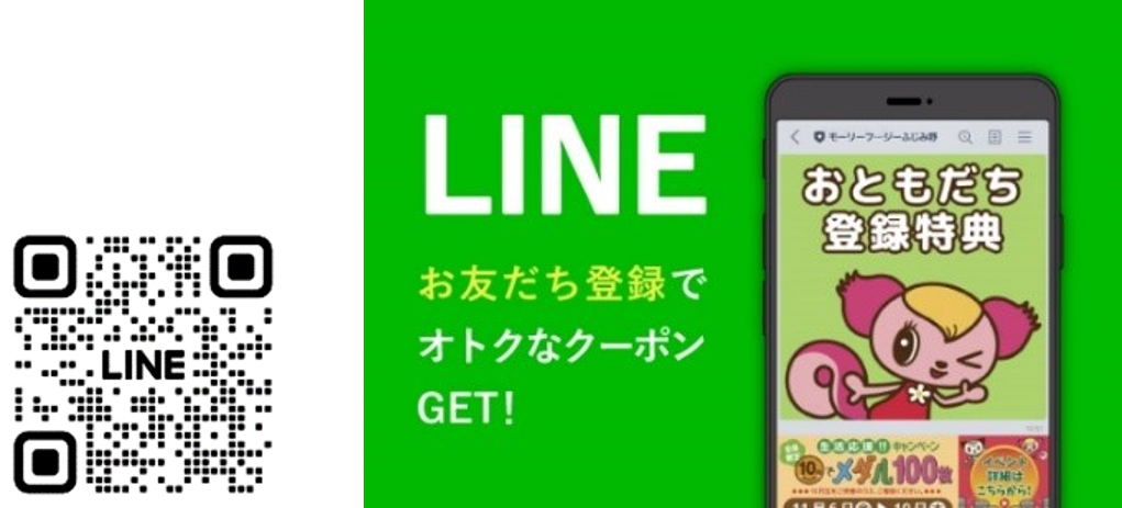 モーリーファンタジー各店のLINE公式アカウントを「友だち追加」すると、お得なクーポンや楽しい最新プライズ・イベント情報を配信します。ぜひご登録ください。