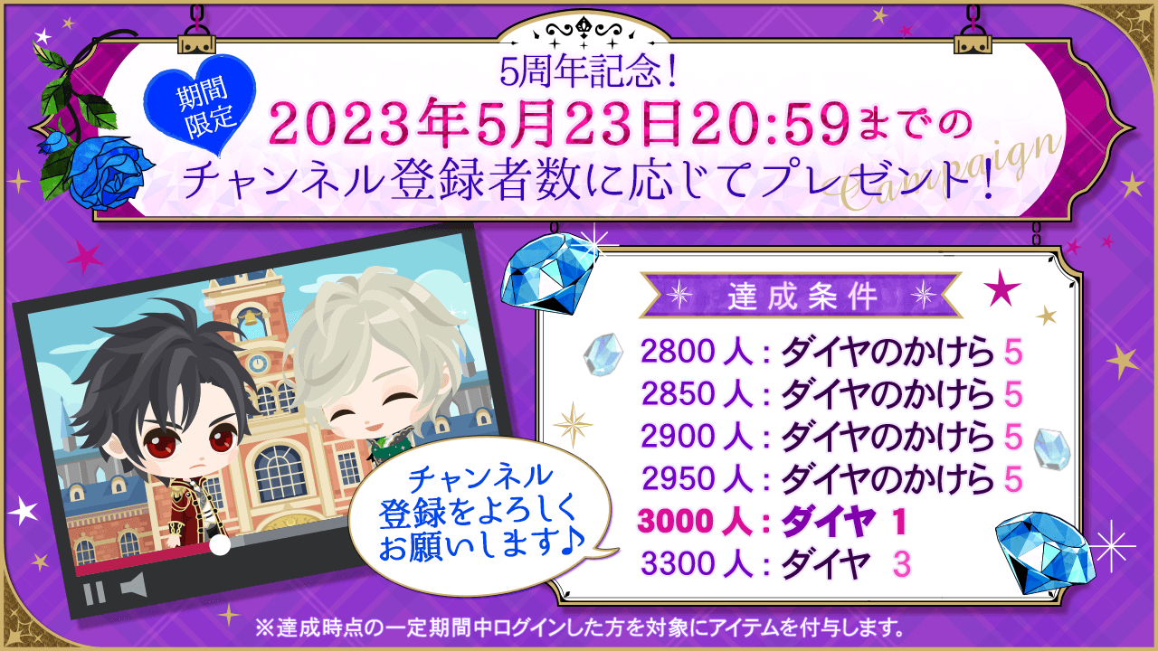 また、配信にあわせて、プレゼントキャンペーンを実施いたします。5月23日(火)20:59までのチャンネル登録者数に応じたアプリ内プレゼントをご用意しております。さらに、生配信中に発表するキーワードを入力するともらえるプレゼント企画もありますので、ぜひチャンネル登録をして本配信をお待ちください。