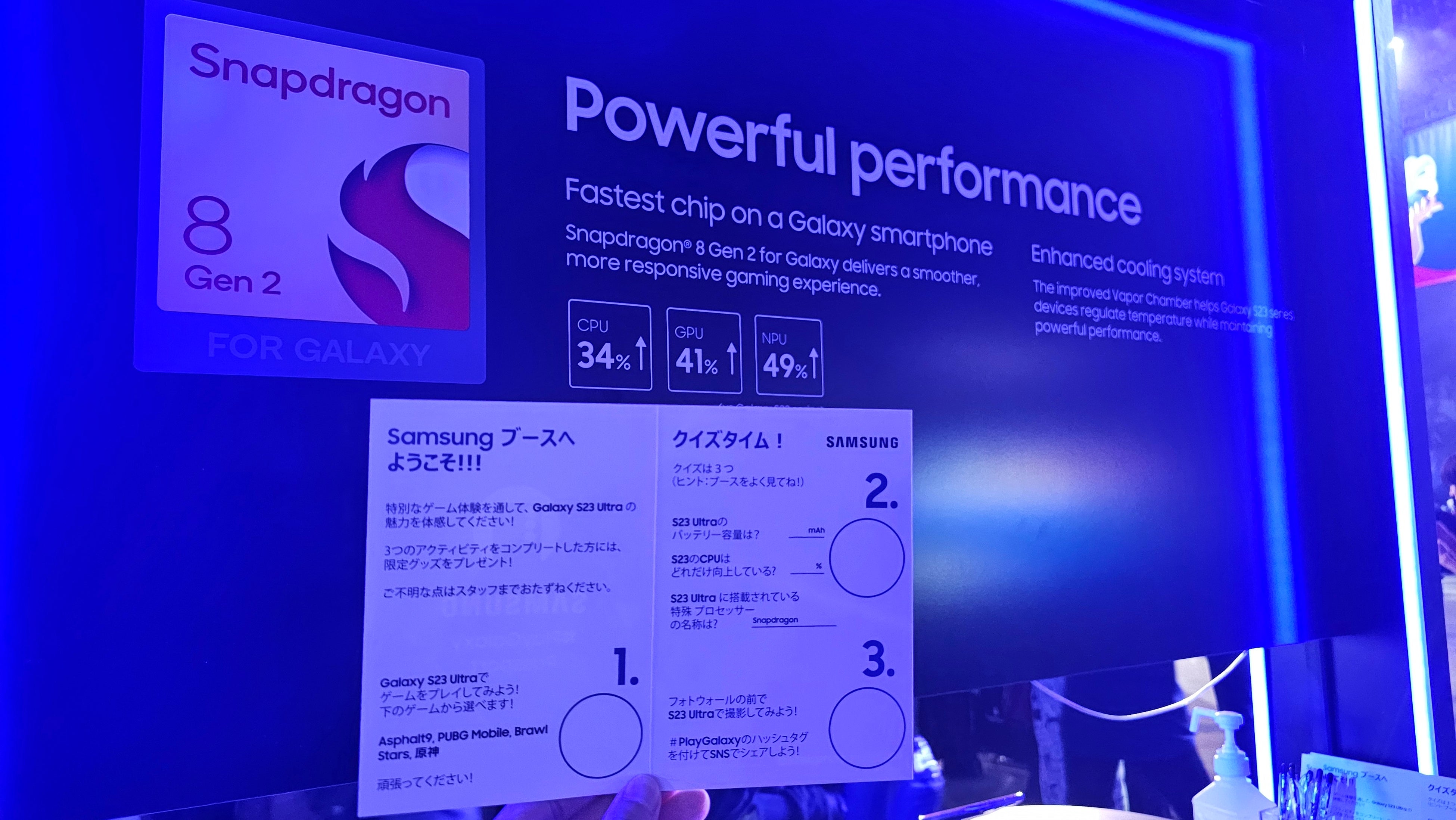 Samsung特別ブース、すごく楽しかったです。Galaxy S23 Ultraを体験してみて思ったのですが、ゲームの体験はもちろん、噂で聞いていた100倍ズームの性能にすごく感動しました。また、S penを使って思い通りの手書き入力ができたので、皆さんも是非体験してみてほしいです!