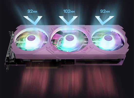 102mmの大型ファンを中心に、両サイドに92mmファンを備えた3連ファンによる強力な風量・風圧でヒートシンクから効率的に放熱します。