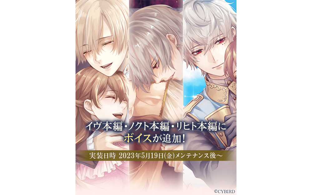 「イヴ=クロス(CV: 内田 雄馬)」と「ノクト=クライン(CV: 江口 拓也)」と「リヒト=クライン(CV: 大海 将一郎)」の本編ストーリーにボイスが追加されました。今後も他キャラクターの本編ストーリーへのボイス追加を予定しているので、どうぞ楽しみにお待ちください。