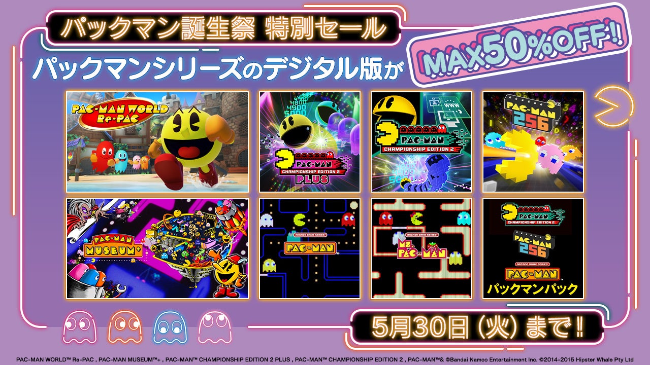 「パックマン」のお誕生日を記念し、最新作「パックマンワールド リ・パック」を含む家庭用ゲームのダウンロード版が、最大50%オフで販売中です。