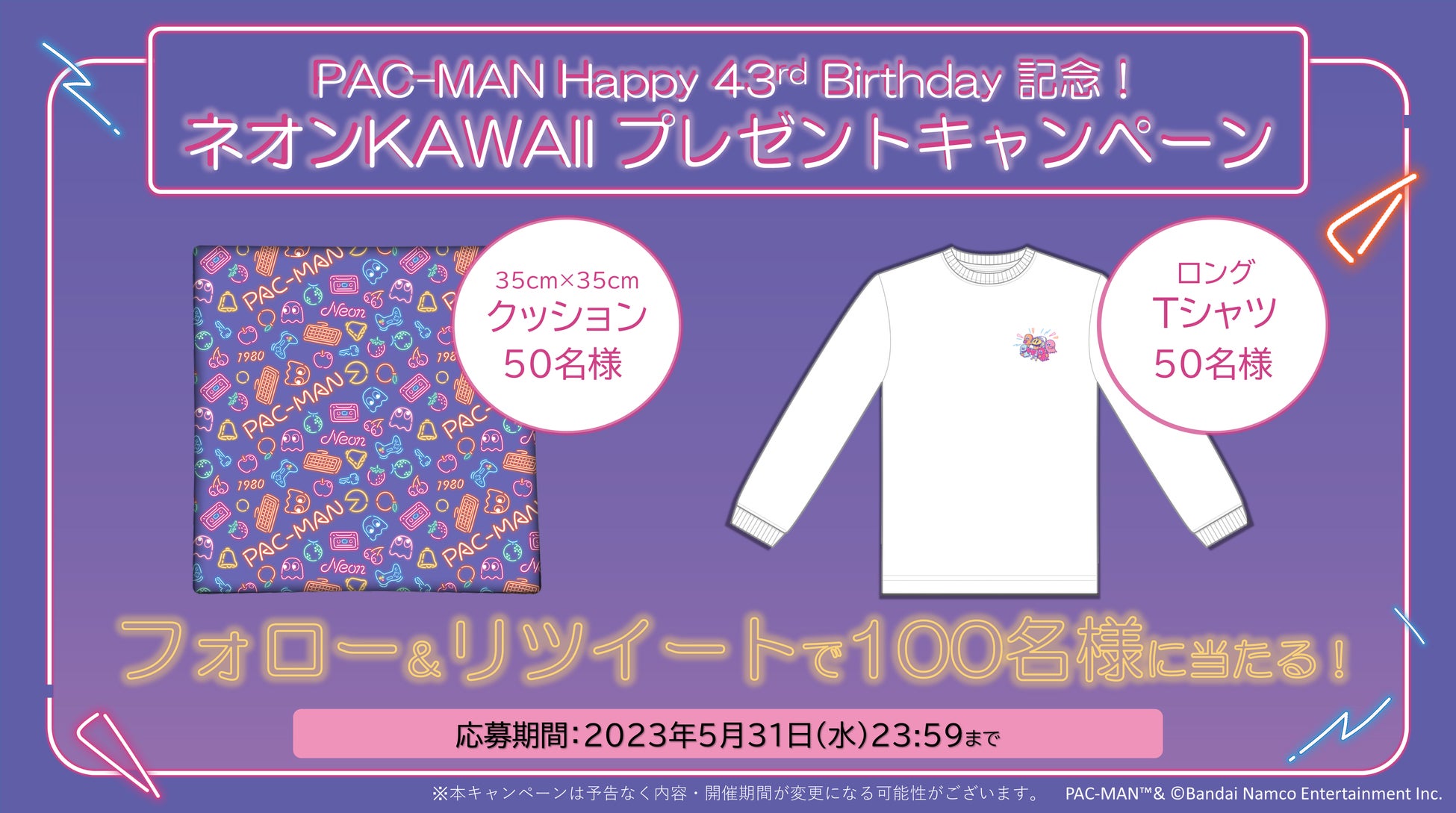 「パックマン」誕生43周年を記念し、2023年5月22日(月)より、パックマン公式Twitterにてフォロー&リツイートキャンペーンを開催します。期間中に「パックマン」公式Twitterアカウント(@BNEI_PACMAN_JP)をフォロー&該当ツイートをリツイートすると、オリジナルロングTシャツもしくはオリジナルクッションが各50名様に当たります。