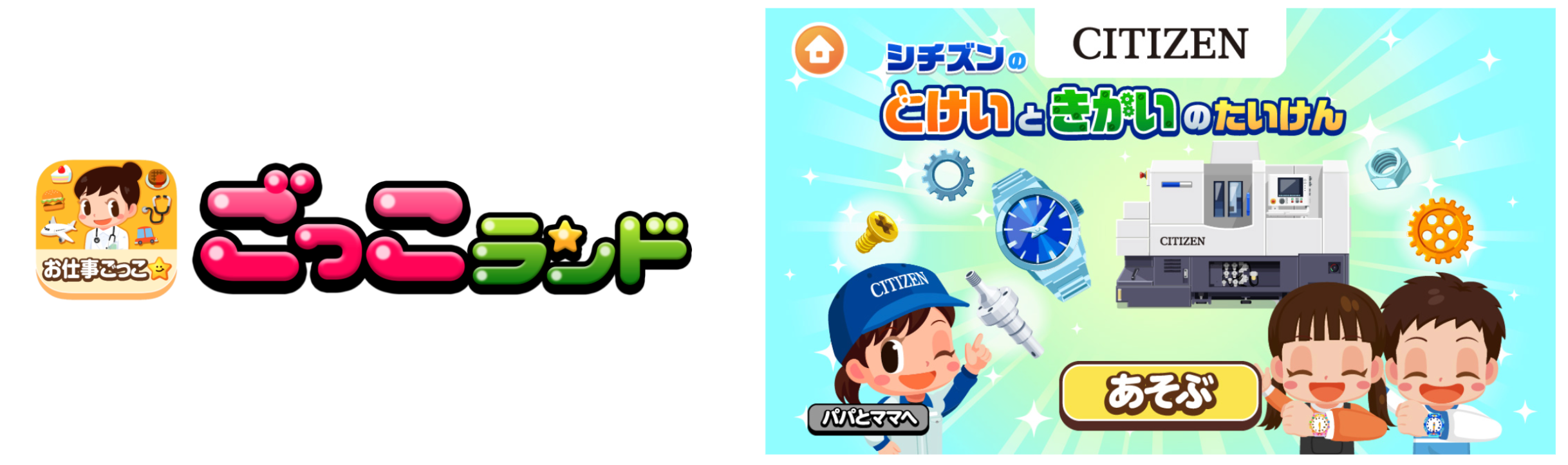 本ゲームを協賛するシチズングループは、腕時計の製造から事業をスタートし、時計事業で培った技術を工作機械や電子機器等の分野に応用し事業を展開する企業です。子どもたちが楽しみながら時計や工作機械について学び、興味・関心を持つことで、アナログ腕時計や工作機械業界をより身近に感じていただきたいという想いから、『ごっこランド』への出店が実現しました。