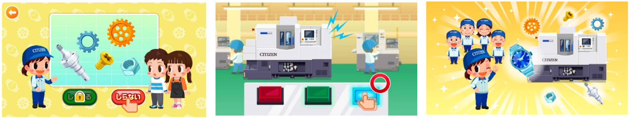 シチズンマシナリーは、時計をはじめ、色々な製品を動かす部品を作るための工作機械を製造しています。ゲームでは、ボタンが光る順番を覚えて、その順番通りにボタンをタップすることで工作機械を動かし、小さな部品を作ります。作られた部品が様々な製品の一部として大切な役割を果たし、人々の生活を支えているということを楽しく学ぶことができます。