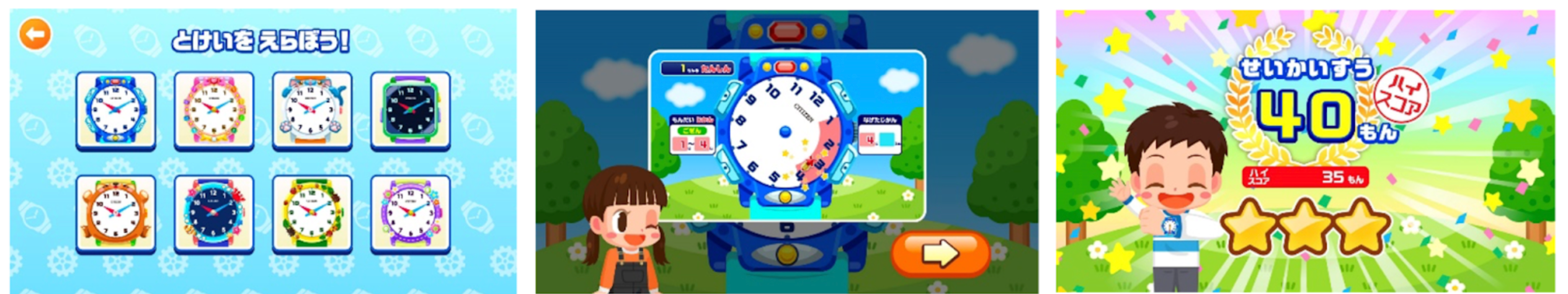 好きな時計のデザインを選び、「もんだい」として表示されている「時間(赤枠)」と「分(青枠)」に合わせて、時計の文字板を狙って矢を投げるゲームです。「かんたん」「ふつう」「むずかしい」の3ステージで構成され、的確に文字板に矢を当ててハイスコアを目指します。