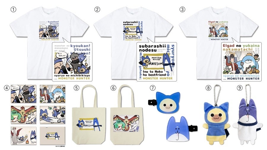 「アイルー」や「ガルク」をはじめ、モンスターとエルガドの愉快な仲間たちのシュールなイラストが様々な商品となってカプコンストアや全国のカプコン直営アミューズメント店舗にて展開いたします。