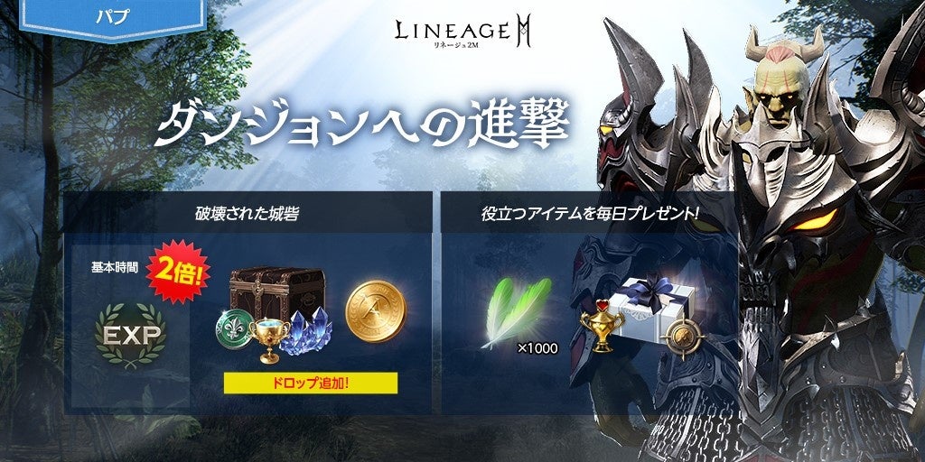 期間中、ダンジョン「破壊された城砦」の基本時間が2時間に増加するほか、EXP獲得量が2倍に増加します。さらにモンスター討伐時、通常と異なり、EXPの他にもアデナを獲得することができるほか、「祝福された城砦の箱(イベント)」が追加でドロップをします