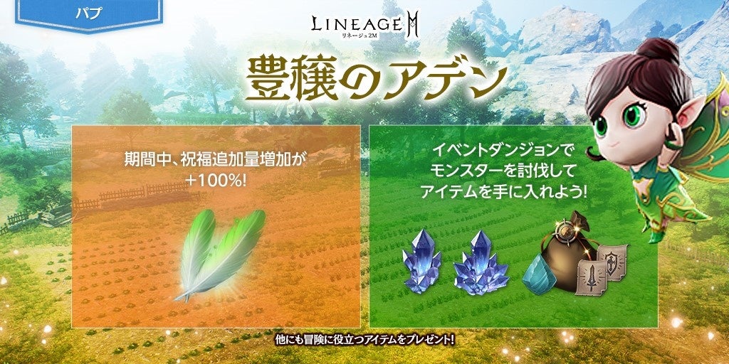 期間中、1日1時間入場できるイベント ダンジョン「豊穣のアデン」が出現します。イベント ダンジョン内でラッキー モンスターを討伐することによって、イベントアイテム「幸運の包み(イベント)」が一定確率でドロップします。