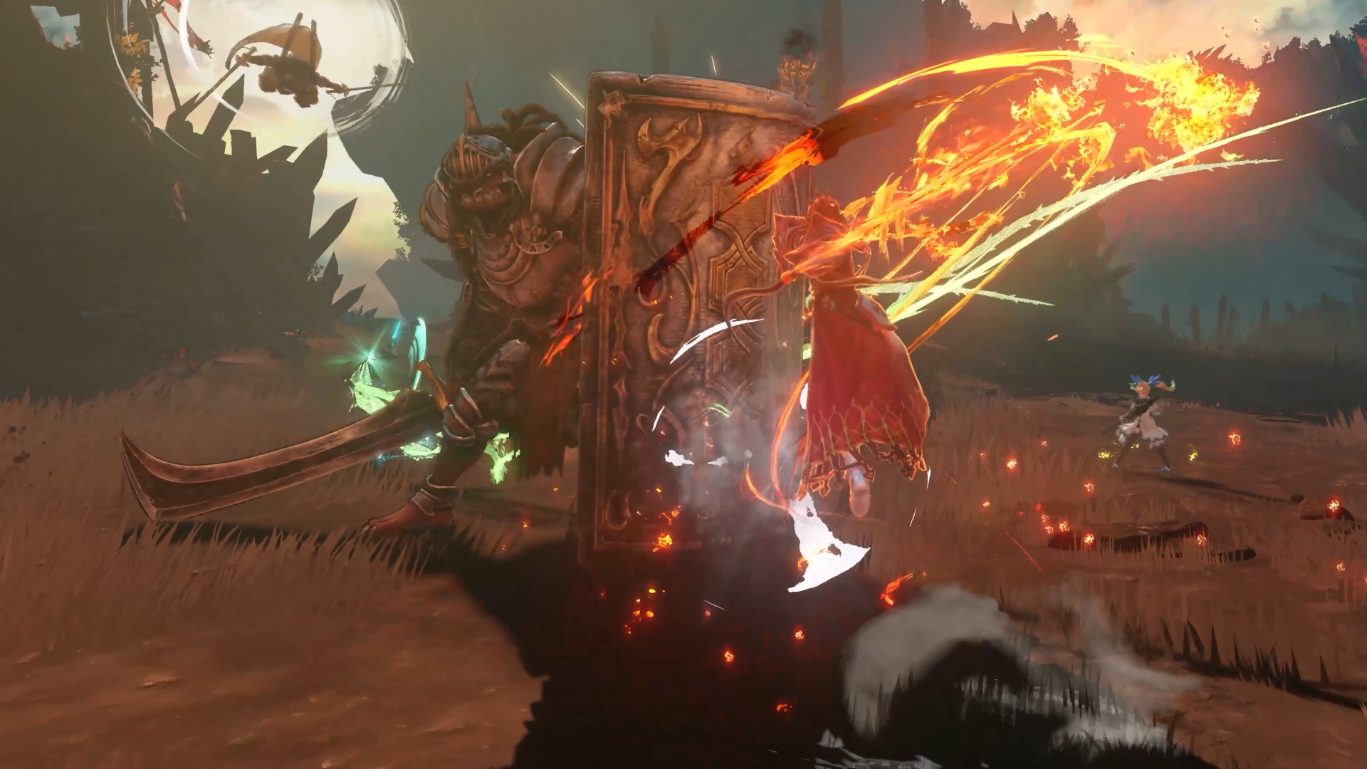 敵の攻撃に怯むことなく、巨躯に任せた斬撃で多数の敵を薙ぎ払う豪快なアクションが特徴。