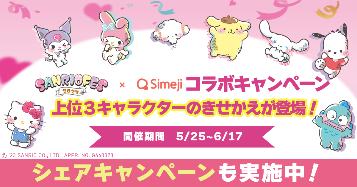 「SANRIO FES 2023」コラボSimejiきせかえ人気投票キャンペーンでTOP3に選ばれたキャラクターのコラボ限定きせかえ全3種類が登場。
