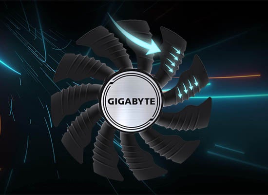 「GV-R76GAMING OC-8GD」は、独自のファンブレードや大型銅板&ヒートパイプなどの高冷却マテリアルと、気流効果を高める「オルタネイトスピニング」やバックプレートから気流を放出する「スクリーンクーリング」など、様々な機能で冷却性能を高めたオリジナル3連ファン「WINDFORCE冷却システム」を搭載。