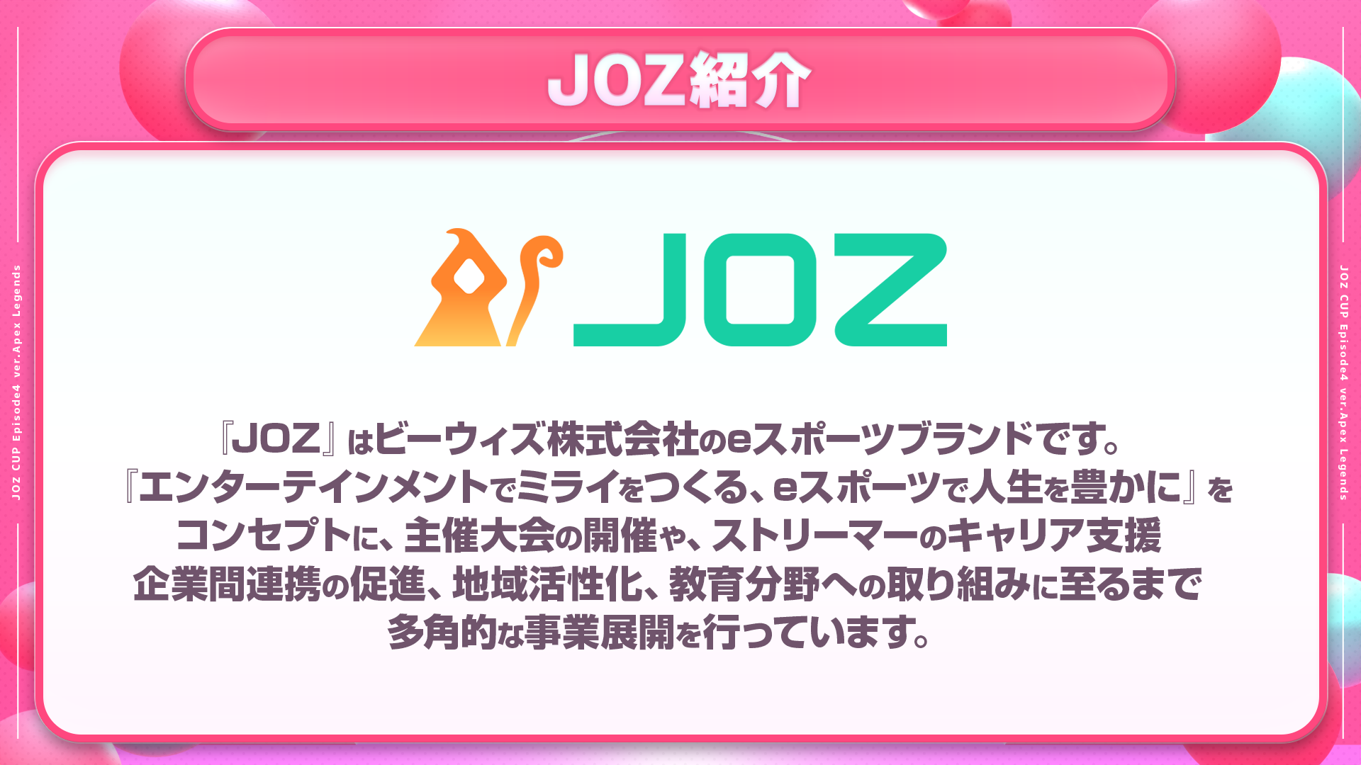 「JOZ CUP」は、ビーウィズ株式会社が主催し、株式会社RATELが運営する「Apex Legends」のカジュアルプレイヤー向けeスポーツ大会です。「ゲームをもっとJOZ(じょーず)に」をコンセプトに、JOZ所属のストリーマーを含む豪華ゲストと一般ゲーマーが賞品を目指し競い合うコンテストです。多数のエンタメコンテンツを用意し、「競技性<エンタメ」に寄せた大会となります。