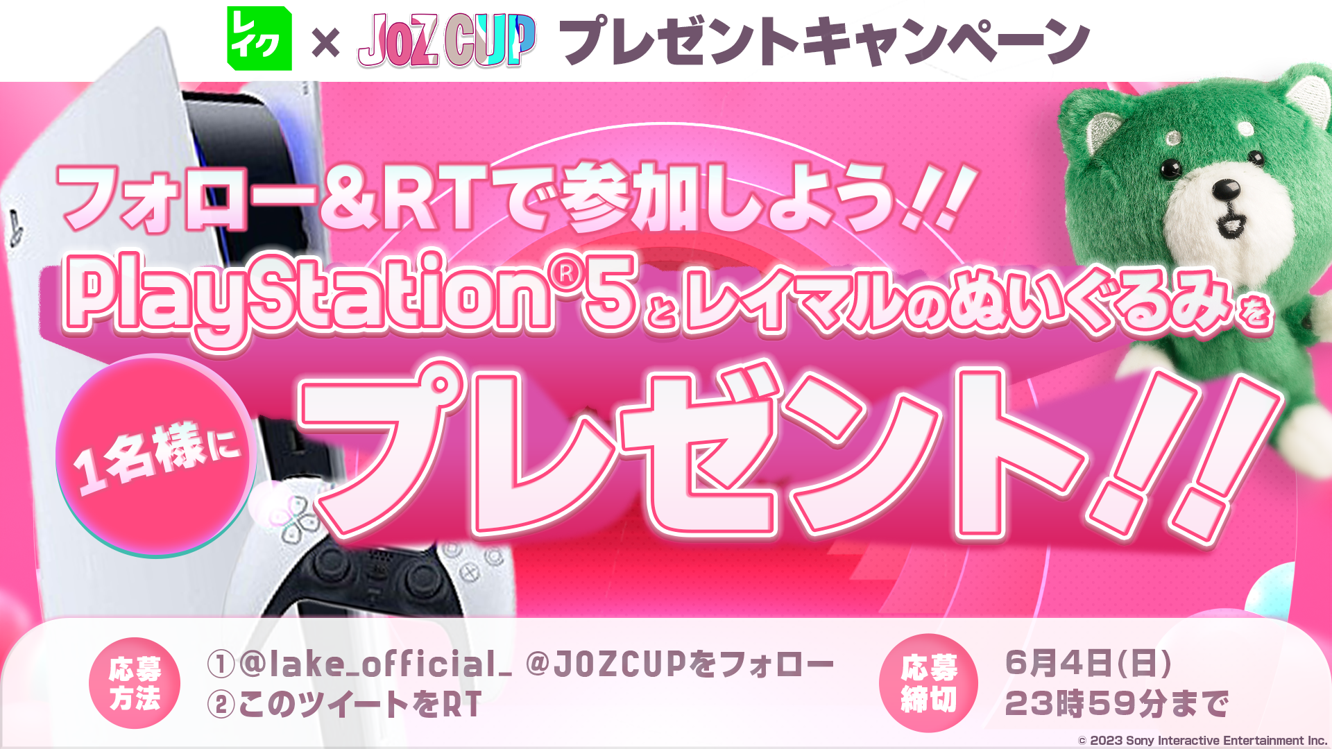 また、この度「JOZ CUP Episode4 powered by レイク」開催を記念したTwitterキャンペーンを6月4日(日)まで実施しています。レイクの公式TwitterアカウントとJOZ CUP公式Twitterアカウントをフォローの上、指定のキャンペーン投稿をリツイート頂くと、抽選で1名様にPlayStation 5とレイマルのぬいぐるみをプレゼントいたします。
