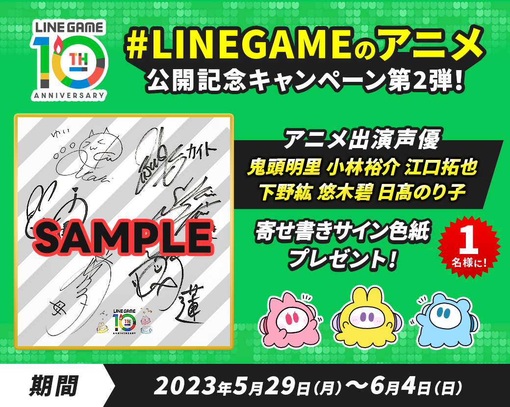 本日、その「LINE GAME10周年」アニメーションのサイドストーリー第2弾『ハートを送りあう会』を公開しました。さらに「LINE GAME」公式Twitterでは、出演声優の寄せ書きサイン色紙が当たるTwitterキャンペーンを開始するほか、5月30日(火)、31日(水)には出演声優の録りおろしボイス付きアニメイラストを公開予定です。