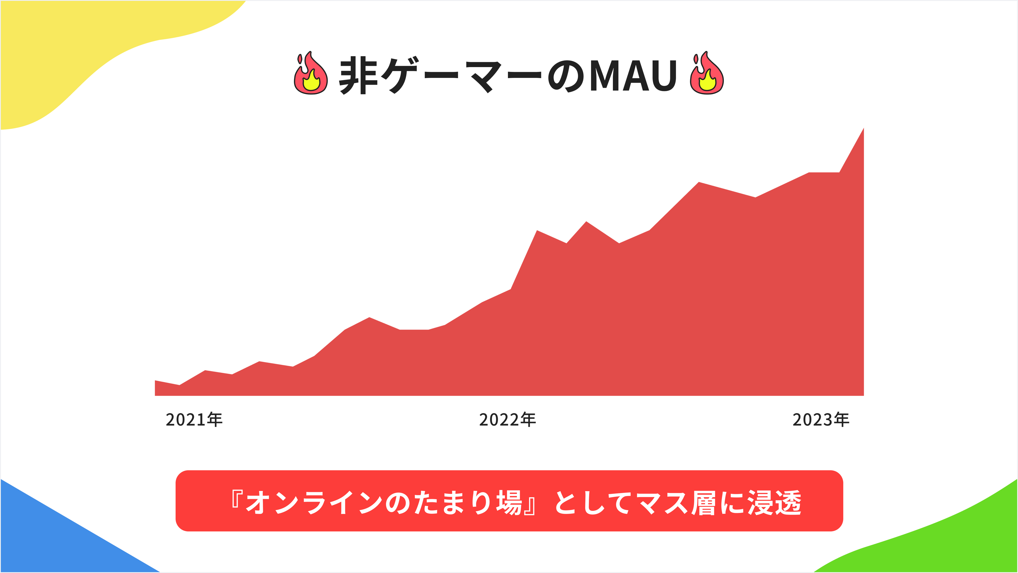 当時は友達とオンラインゲームをするためにパラレルを使う、いわゆる”ゲーマー”がユーザーの大半を占めていましたが、友達同士の口コミを起点とし、普段あまりゲームをしないマス層である”非ゲーマー”にも拡がりました。現在は、放課後や暇な時間に友達と主におしゃべりをする場としてパラレルを使うユースケースが大きく伸びており(下図:非ゲーマーのMAU)、2022年3月~2023年3月の前年月対比の平均成長率は210%となりました。パラレル全体のMAUもサービスリリース以降、右肩あがりに伸び続けています。