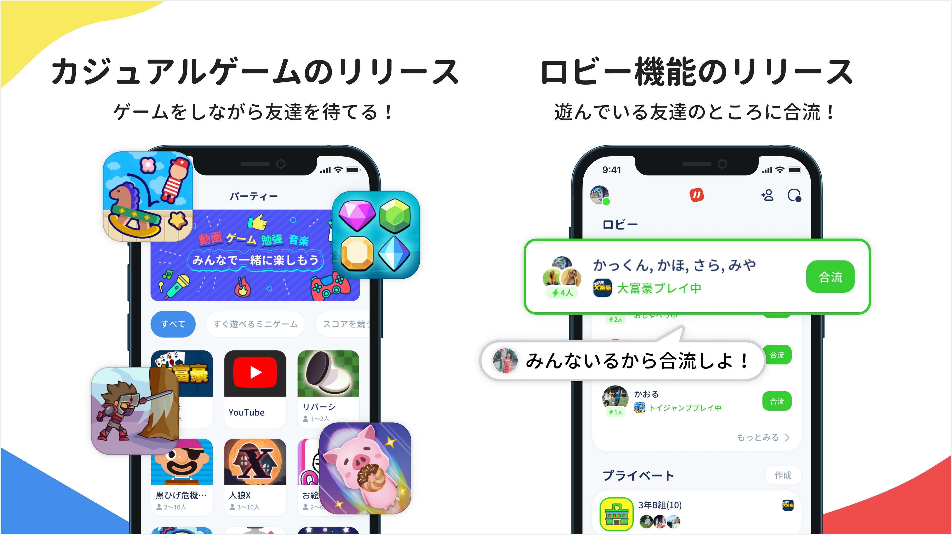 ロビーでゲームをしたり音楽を聴いたりしていると、それに気づいた友達が自然と合流し、おしゃべりやコンテンツを楽しむことができる場