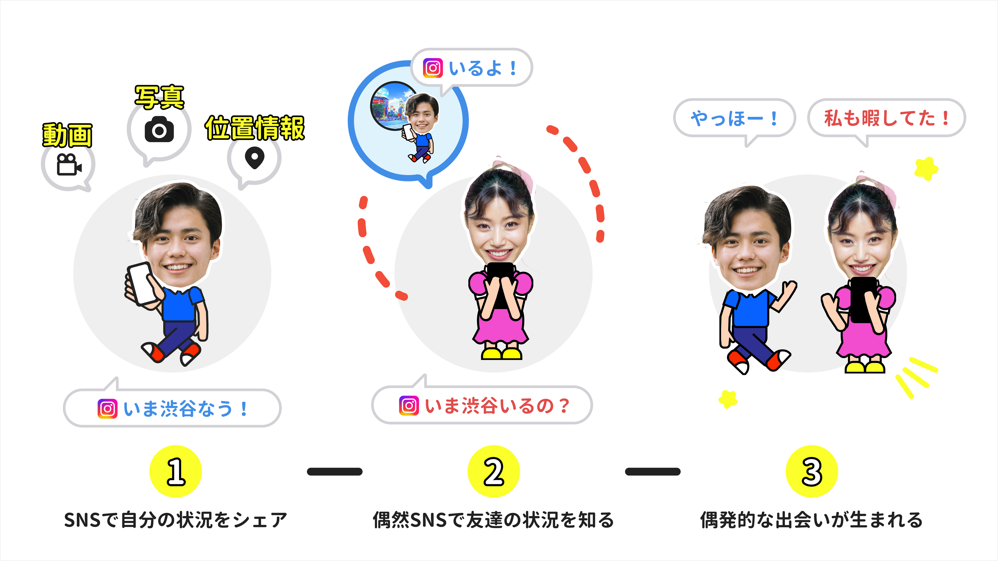 それは、Z世代が友達とコミュニケーションを取る時、直接自分から連絡するのではなく、まずSNSに投稿することで間接的に自分の今を伝え、投稿に反応した友達とやりとりをすることが多いということです。例えば、InstagramのストーリーズやBeRealのように今の状況を動画や写真で投稿したり、位置情報SNSで自分の居場所を常時共有したりすることは、自分の状況を知った上で興味を持った友達から偶発的な連絡が発生することを期待しているのです。