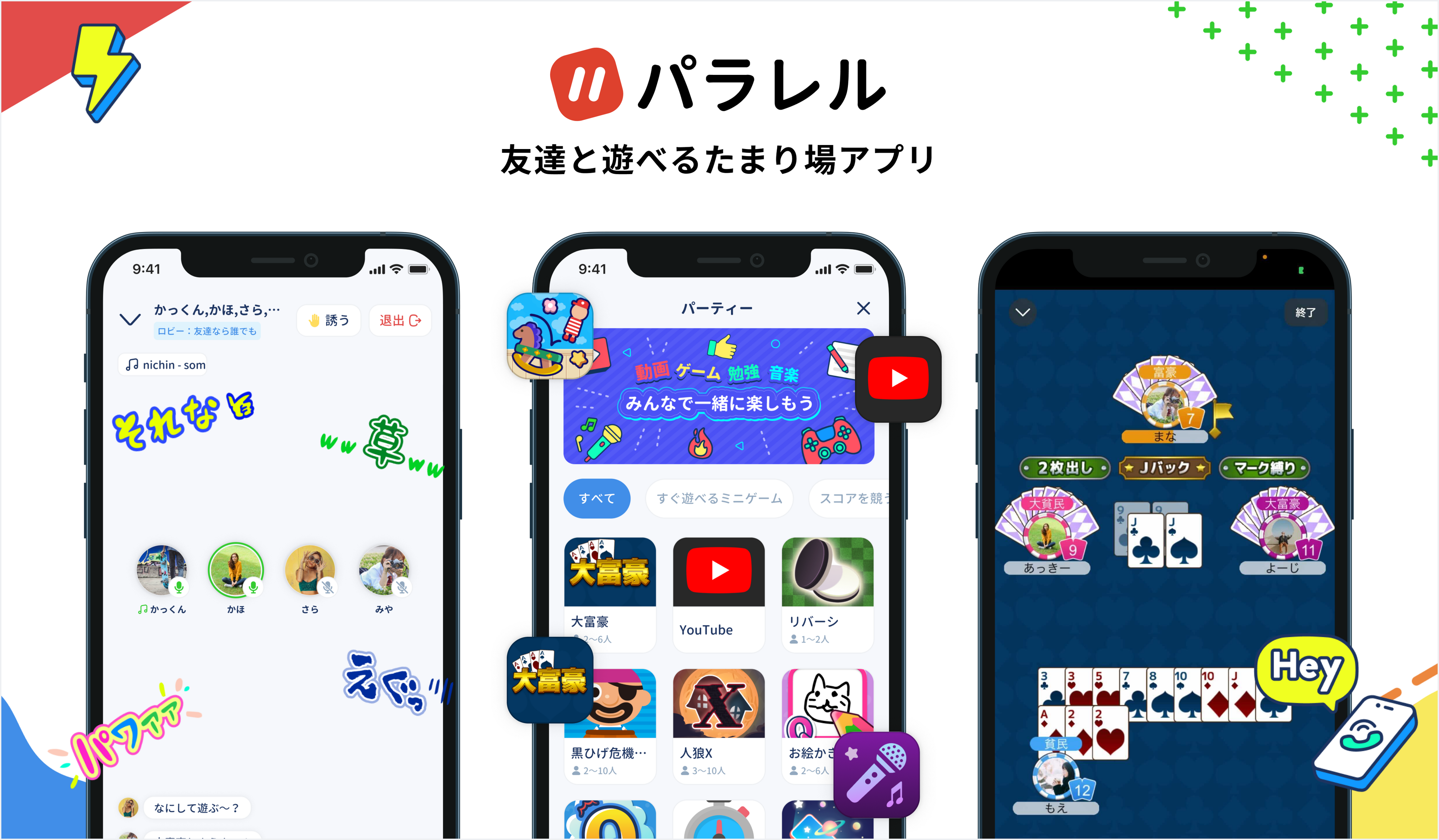 パラレルは、仲の良い友達とおしゃべりしながら様々なミニゲームで遊んだり、動画や音楽を同時視聴したり、カラオケなどを楽しんだりすることができるオンラインのたまり場SNSです。