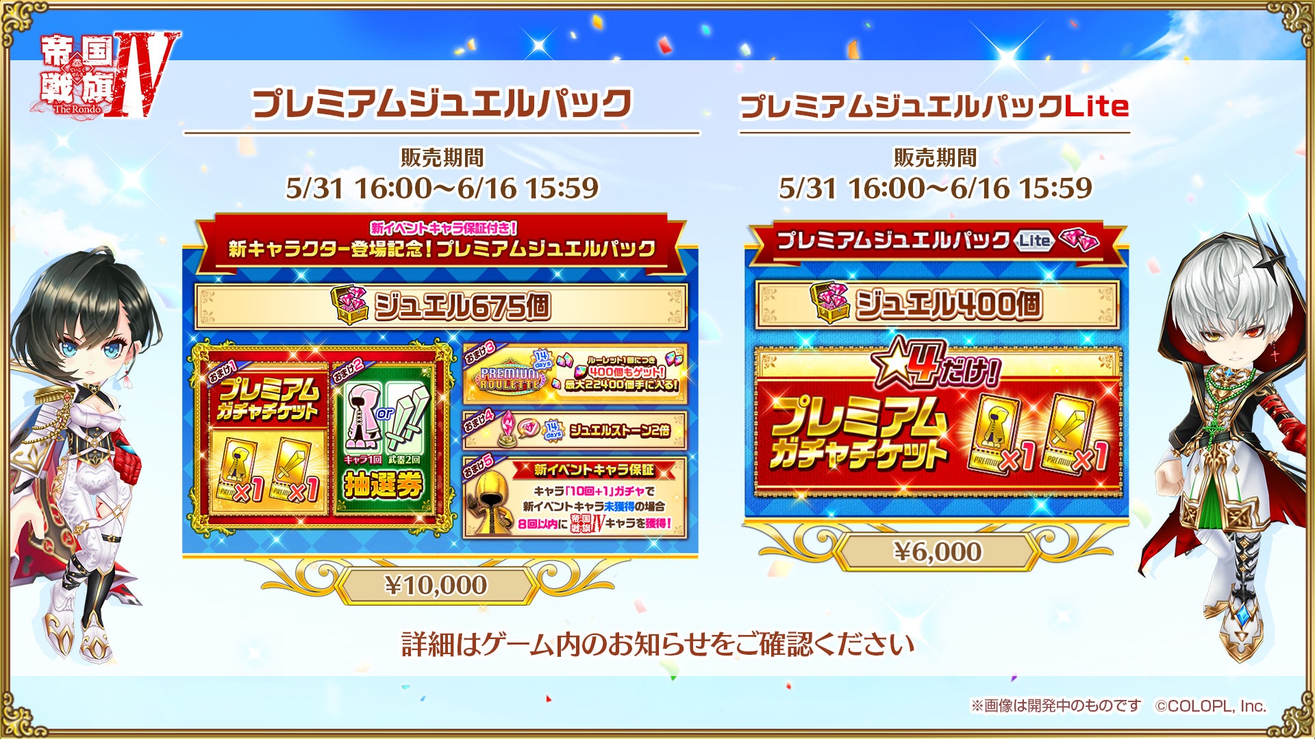 ・内容物:「ジュエル」675個、「キャラ1体or武器2個抽選券」1枚、「プレミアムキャラガチャチケット」1枚、「プレミアム武器ガチャチケット」1枚、「新イベントキャラ保証」、「プレミアムデイリールーレット」14日間、「ジュエルストーン2倍」14日間