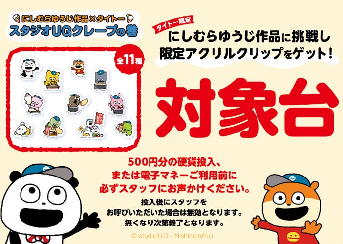 タイトーオンラインクレーン(タイクレ)をご利用の場合は、対象台バナーのついたプライズに有償TC(タイトーコイン)15,000以上連続プレイいただくと、もれなく「限定アクリルクリップ」1個と「抽選券」をプレゼントいたします。