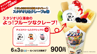 にしむらゆうじの描き下ろしイラストを使用したコラボクレープ「スタジオUG渾身の よっ!フルーツなクレープ!」が登場です!