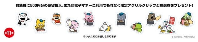 6月3日(土)よりタイトーステーションの対象台POPのついたゲーム機に、500円分の硬貨投入または電子マネーご使用で、もれなく「限定アクリルクリップ(全11種)」1個と「抽選券」をプレゼントいたします。