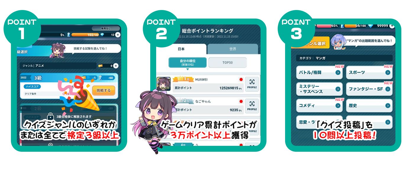 1.クイズジャンルのうち、1カテゴリの「検定3級」以上を取得