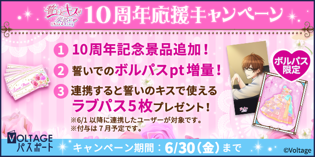 株式会社ボルテージ(本社:東京都渋谷区 代表取締役:津谷 祐司)は、提供中のボル恋タイトル「誓いのキスは突然に Love Ring」(以下「誓キスLR」)が6月1日(木)に配信10周年を迎えたことをお知らせいたします。