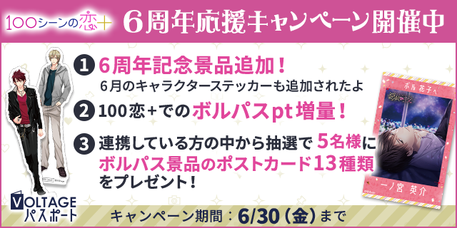株式会社ボルテージ(本社:東京都渋谷区 代表取締役:津谷 祐司)は、提供中のボル恋タイトル「100シーンの恋+」が6月1日(木)に配信6周年を迎えたことをお知らせいたします。