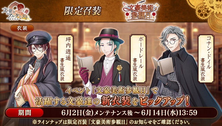 さらに、イベントと同時に開催される限定召装『文豪美術参観日』にて新規追加された「坪内逍遥」「ボードレール」「コナン・ドイル」の〈書生風衣装〉を編成すると、得点の獲得率がそれぞれ30%上昇します。