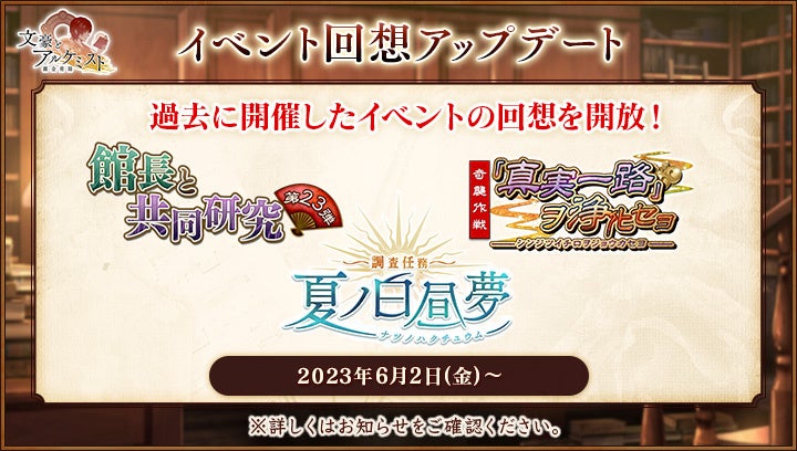 過去に開催したイベントの回想を開放いたしました。今回のアップデートでは、以下3つのイベント回想が図鑑よりいつでも確認できます。